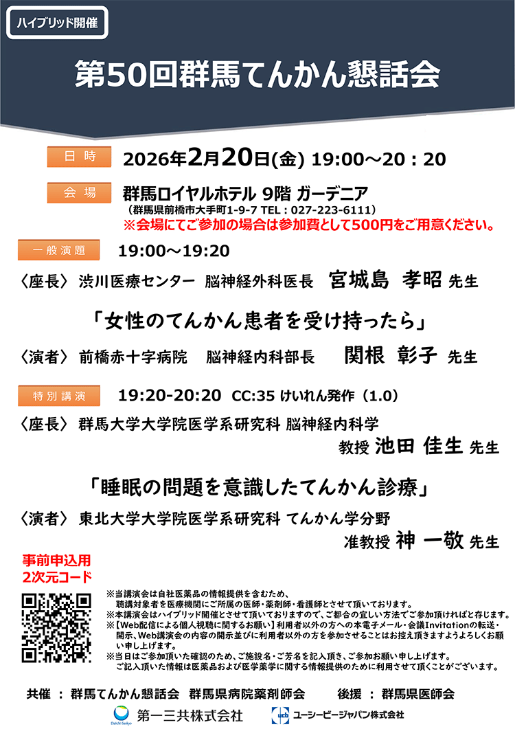 【一般演題】『女性のてんかん患者を受け持ったら』 【特別講演】『睡眠の問題を意識したてんかん診療』