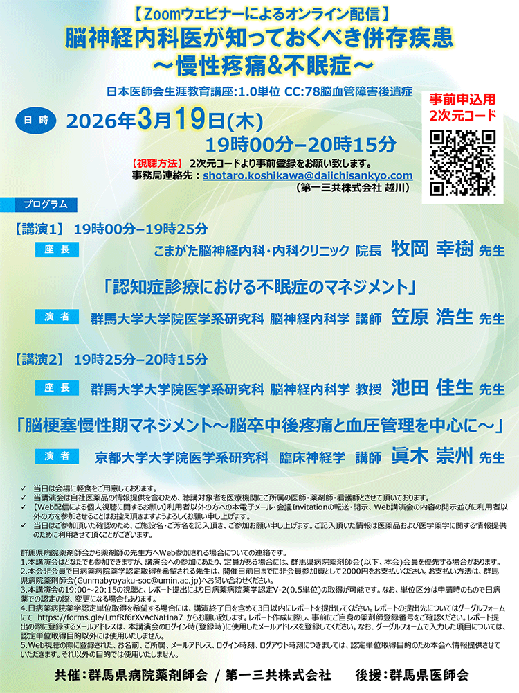 【講演1】『認知症診療における不眠症のマネジメント』 【講演2】『脳梗塞慢性期マネジメント~脳卒中後疼痛と血圧管理を中心に~』