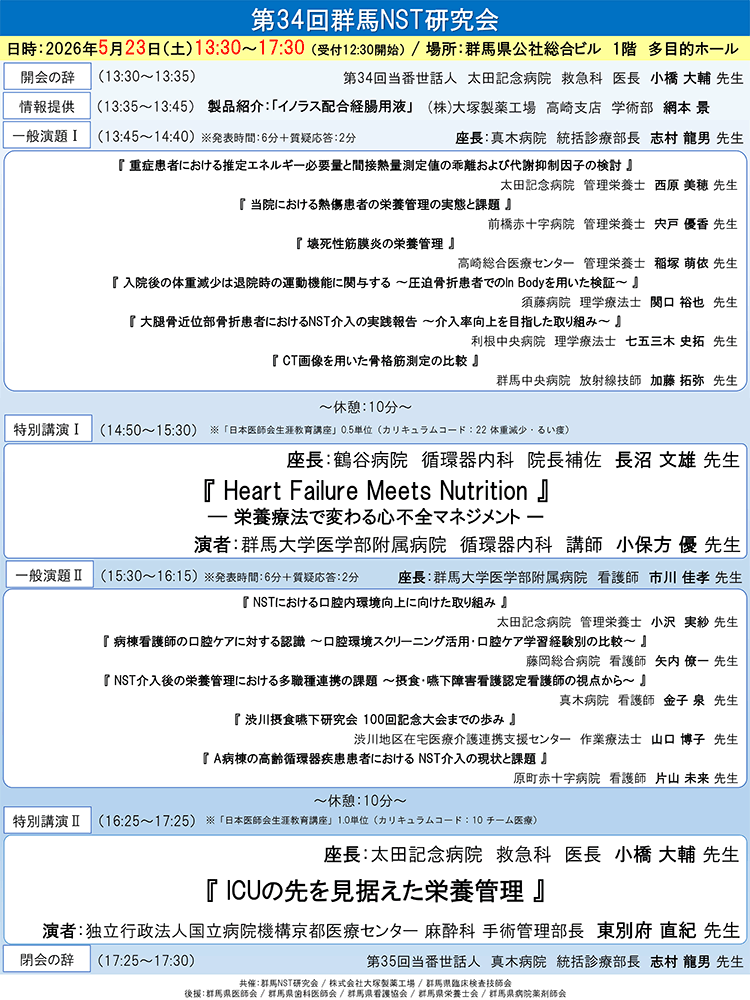 【一般演題Ⅰ/Ⅱ】 【特別講演Ⅰ】『Heart Failure Meets Nutrition』 ー栄養療法で変わる心不全マネジメント ー 【特別講演Ⅱ】『ICUの先を見据えた栄養管理』