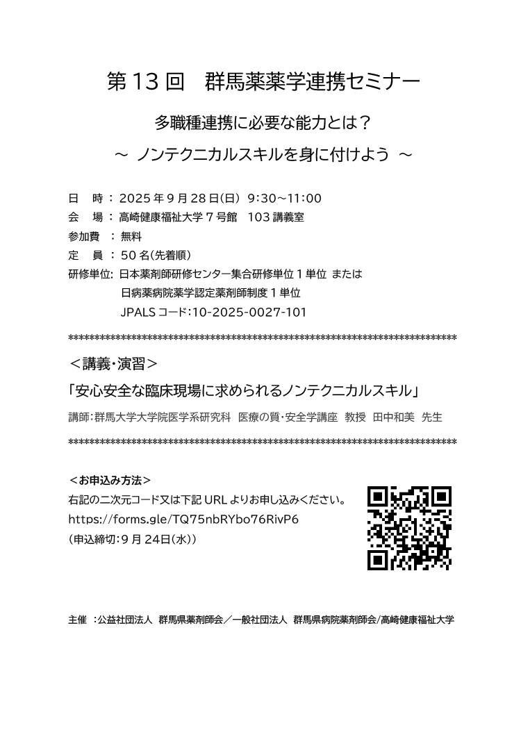 開催日:2025年9月28日会場:高崎健康福祉大学 7号館 103講義室 【講義】『安心安全な臨床現場に求められるノンテクニカルスキル』